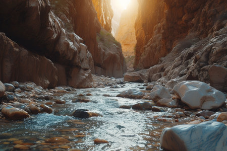 The sun dips low in the sky, casting a warm glow on the canyon walls as a river flows through a rocky path. The water rushes over boulders, creating a series of small waterfalls. The air is still and quiet, and the only sound is the gentle rushing of the water.