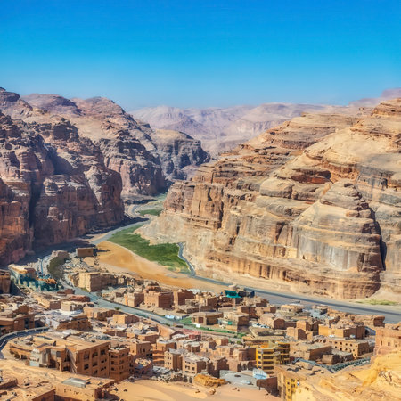 Cityscape view of Wadi Musa town located in southern Jordan and the nearest town to the archaeological site of Petra