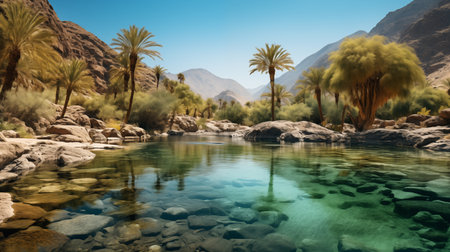 Marvel at Oman's verdant gem, a hidden paradise where crystal waters flow through a lush valley, surrounded by a canopy of date palms, creating a serene and inviting atmosphere of tranquility. AI-generated