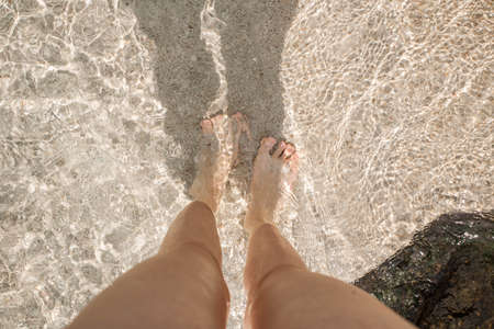Young woman stands in the crystal clear water. Female legs on the tropical sandy beach. Sunlight and transparent clean ocean water. Phu Quoc island, Vietnam.