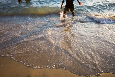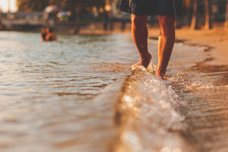A man walking on the beach and sea water flow in sunset time.