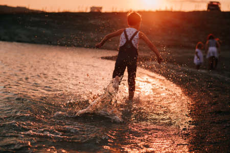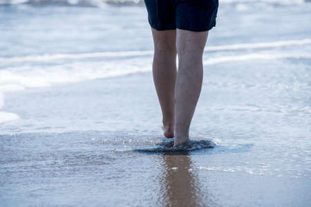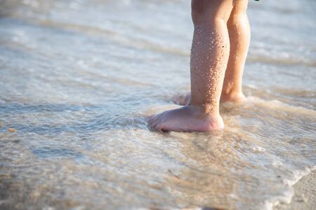 Vacation concept. Close up of boy's legs walking on the water by the beach. Child by the sea with reflection on wet sand.
