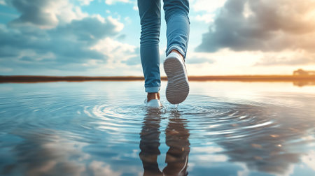 A person walks on the water's surface, creating ripples beneath. The tranquil scene showcases a beautiful sky and reflective water, evoking a sense of serenity.