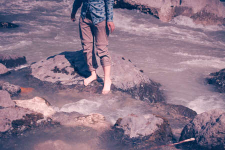 Bare feet girls walking in a stream of mountain river. Travel Lifestyle concept healthy lifestyle.