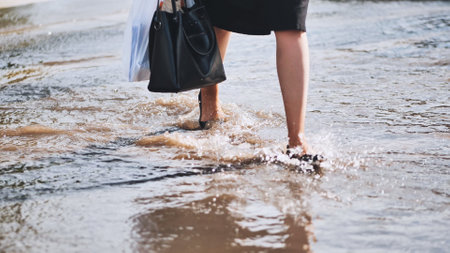 Businesswoman wading through dirty flood water on city street after heavy rain, holding bag and wearing black shoes