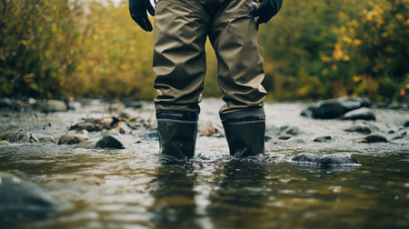 Fisherman in waders standing in shallow river with fishing equipment generative ai