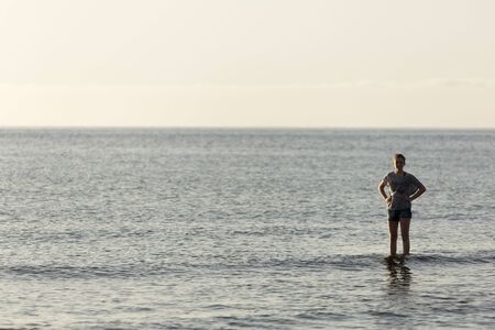 The young man standing in the sea In the morning