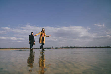 Young couple in warm coats having fun on the river bank. Walking on the river