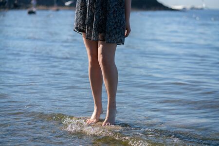 Legs of a young woman walking by the sea. Young woman's barefoot walking in the stream. Front view.