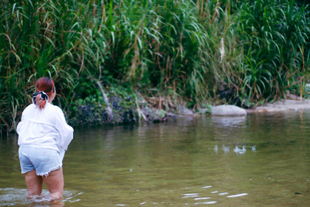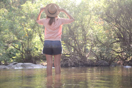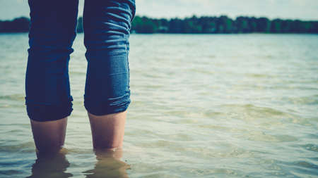 Woman leg walk in clear clean river with sand bed - people relax vacation slow life concept