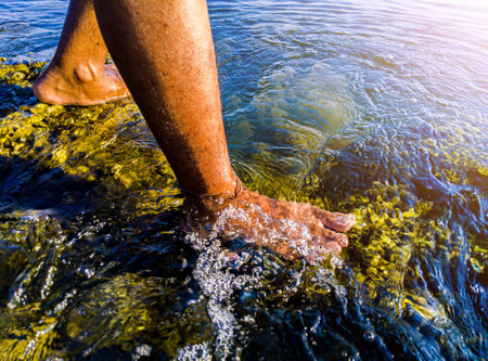 Feet of a man in jeans and a T-shirt splashing water on the sea