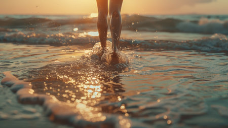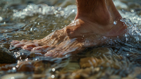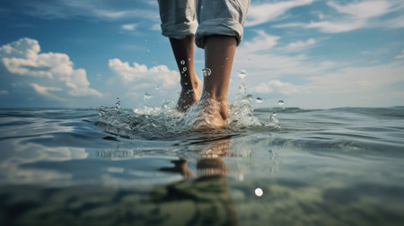 A vibrant close-up capturing a person walking through water, creating dynamic splashes under warm sunlight, evoking a sense of adventure and freedom.