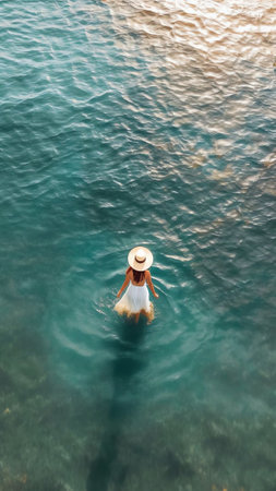 A serene moment captured as a person walks through water during sunset, creating beautiful splashes against a tranquil landscape. The scene evokes adventure and relaxation.