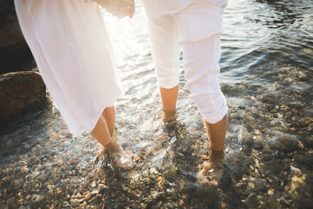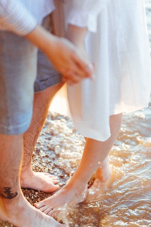The legs of men and women who are close to each other. Seashore.