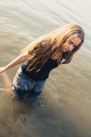Beauty, nature, youth, freedom concept. Happy beautiful smiling teenager girl enjoying sea water, sea evening nature, looking at the camera