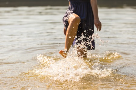 Girl splashing water in lake by her leg. Close up of water droplets in motion and human silhouette