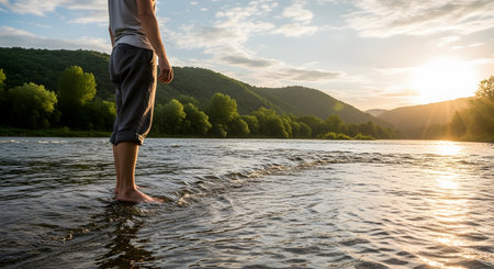 A person stands barefoot in a shallow river, enjoying the cool water while watching the sunset over lush green hills. The golden hour light reflects on the rippling water, creating a serene and meditative atmosphere.