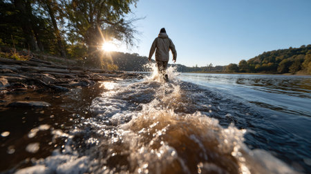 A solitary man walks through the shallow waters of a river at sunset, creating splashes that reflect the golden light and surrounding landscape, evoking peace and adventure.