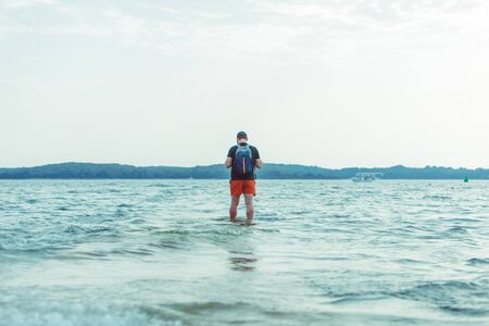 man standing in the sea water at beach copy space