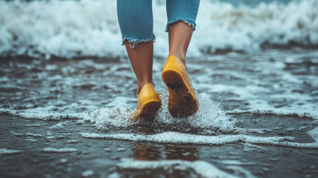 A person enjoys a serene moment while walking barefoot through the shallow ocean water, creating splashes with bright yellow footwear.