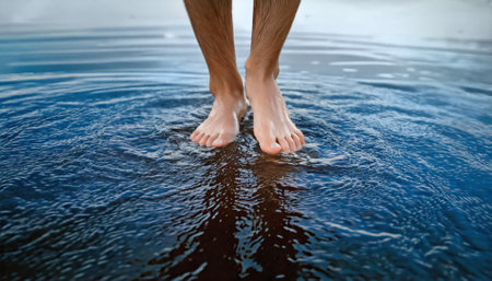 AI generated image showing a pair of male feet walking over water surface