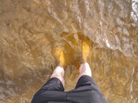 Close-up of a man's feet on the sand in the sea