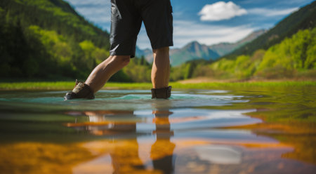 A person wearing hiking shoes walking through a stream. Generative AI image.