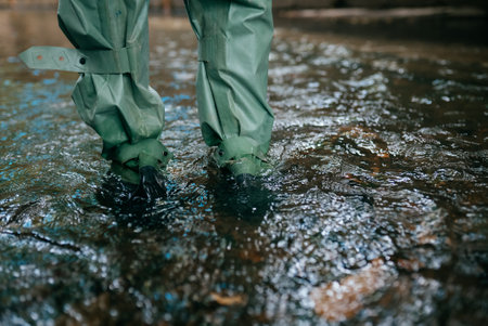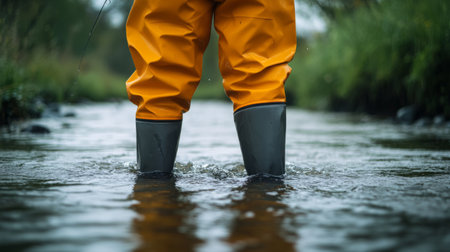 A person standing in a river with their feet wet, AI