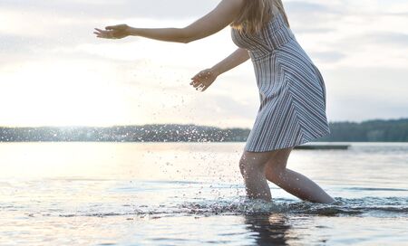 Young smiling woman in summer dress stands barefoot in water and washes her hands. Outdoors at sunset with copy space