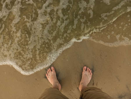 feet on beach, vacation on beach with bare feet standing on the clear white sandy beach, Asian man feet standing next to clear blue water waves