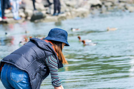 A Chinese young woman finding seashell at the river at the Shenzhen Bay of China during weekend.