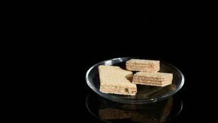 Wafer cookies with caramel in a transparent substrate on a black background.