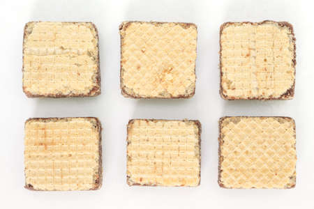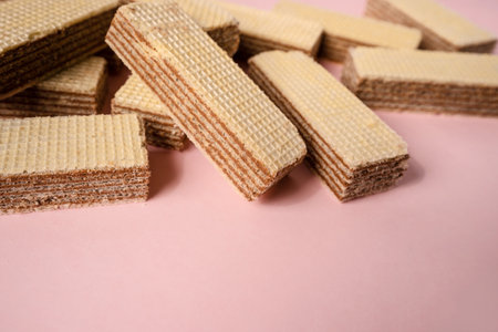 delicious and crunchy waffles with chocolate filling, industrial production, closeup of sweets and high-calorie food
