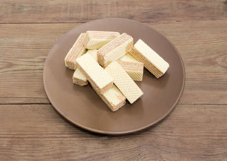 Sweet wafers filled with chocolate and vanilla cream on a plate on a wooden table.