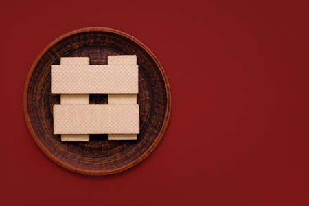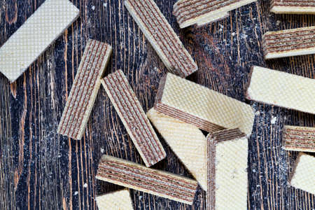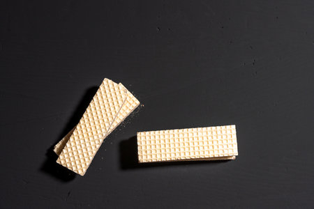 Sweet wafers on black background, flat lay. Sweet food. Background texture