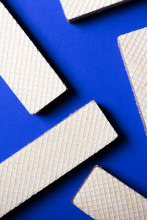 Square chocolate wafer biscuits with hazelnut on blue background. Top view.