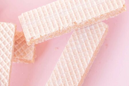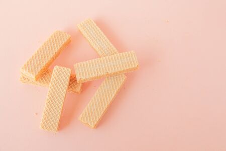 Tasty wafer sticks on pink background. Sweet food. Top view