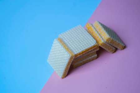 A pile of square, yellow wafers arranged on a blue and pink background. Copy space