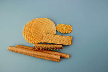 Three types of waffles on a blue background. Round waffles, filled waffles and long wafer rolls.