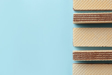 Tasty wafer sticks on blue background, flat lay with space for text. sweet food