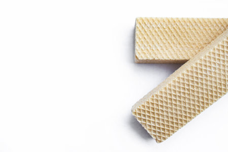 Two crispy waffles with filling placed on a clean white background, showcasing their golden texture and sweet layers