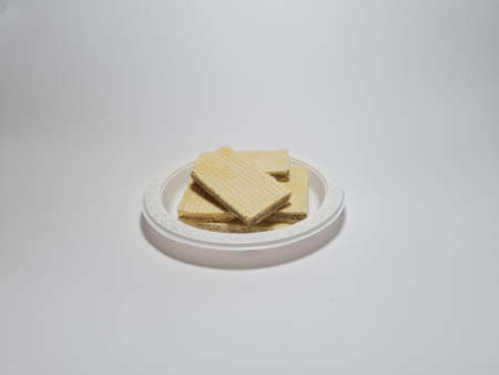 A close up of a few pieces of wafers on a black background. The wafers are white and appear to be square in shape