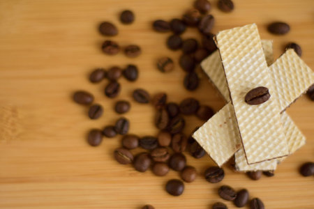 Composition with waffles and coffee beans. Small coffee wafers. Top view.
