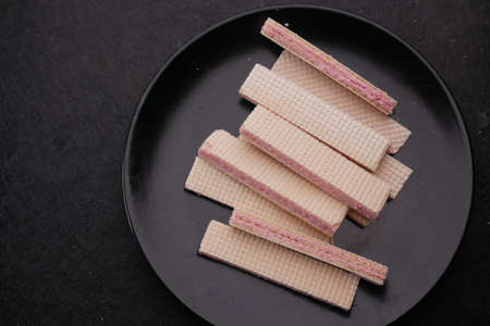 Dessert waffle cookies on a black table. Wafer biscuits. Sweet dessert. Sweets for coffee or tea. Food photo. Kitchen table. Culinary product. Bakery. Background image.