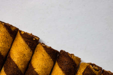 Macro selective focus on chocolate wafer rolls. Chocolate sticks background
