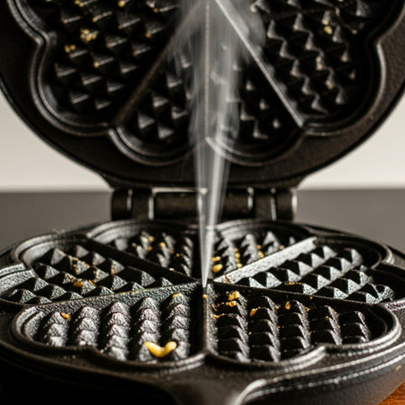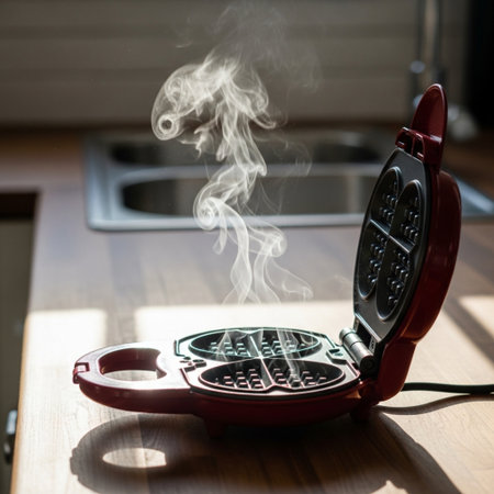 Waffle iron on the kitchen table with smoke coming out from the oven