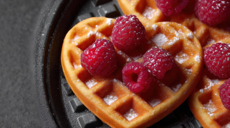 Delight in these heart-shaped waffles topped with fresh raspberries and a sprinkle of powdered sugar, ideal for romantic meals or special celebrations.