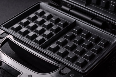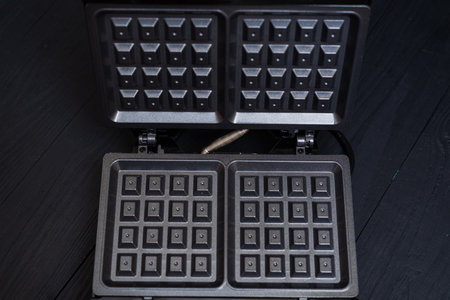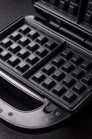 Electric waffle iron on a black wooden background. Device for making Belgian waffles.