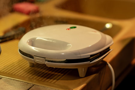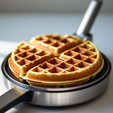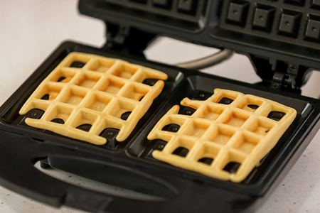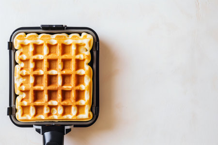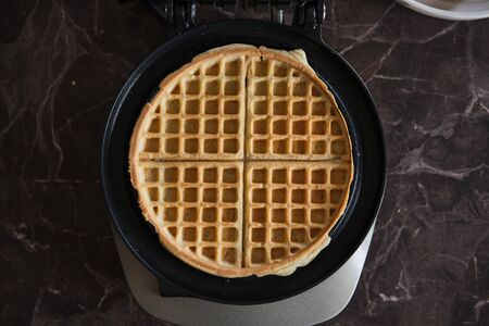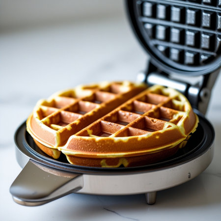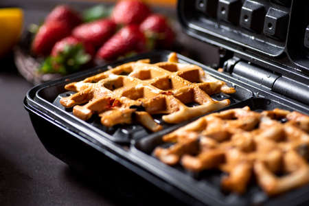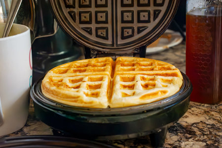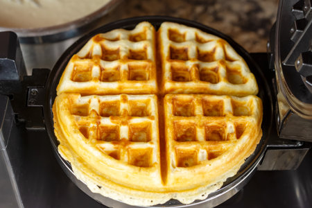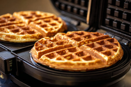 Delicious golden waffles cooking in a waffle maker at a cozy kitchen setting during breakfast time