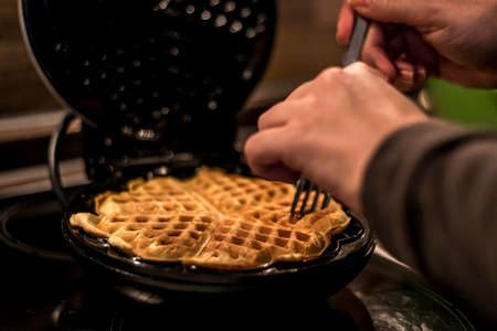 Bake waffles on a special device. Make sweet waffles. Delicious dessert for children. Self-sentencing waffles on the equipment